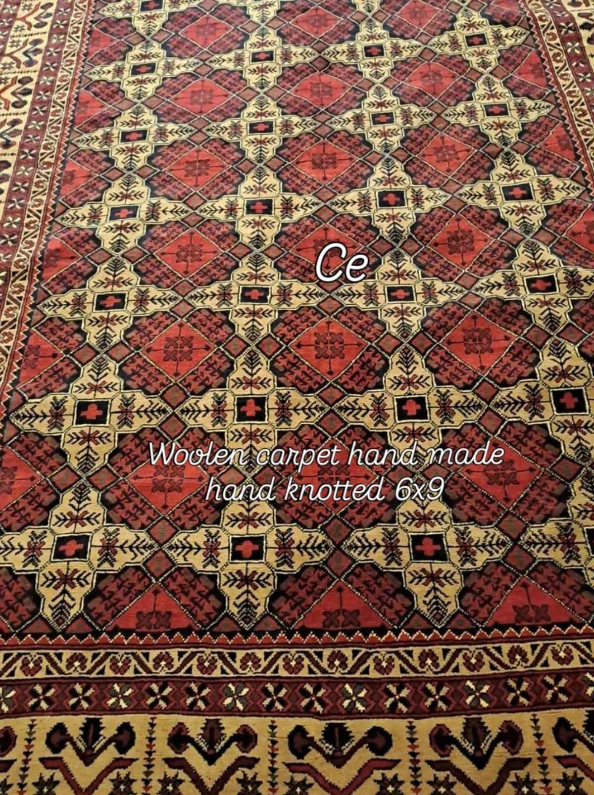 A durable and stylish 6×9 woolen carpet, hand made and hand knotted with precision. Featuring bold geometric patterns in rich tones, this rug is perfect for high-traffic areas while adding warmth and character to any room.